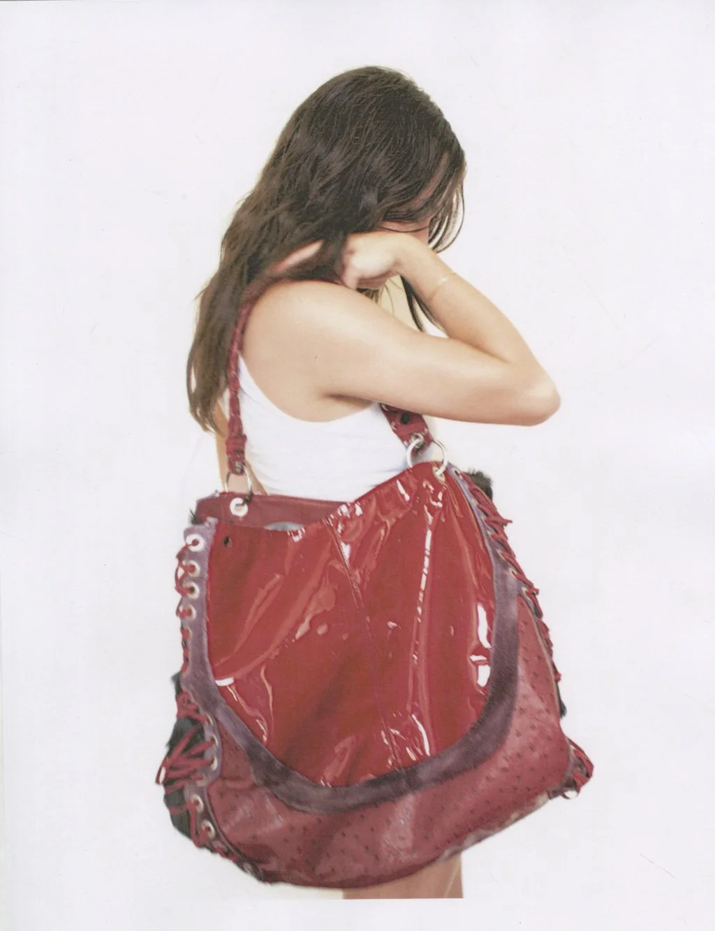A bold city bag in red patent leather, maroon suede, and embossed ostrich, with black wildebeest side panels and red suede corset-lacing threaded through silver grommets. Dominion demands attention — an everyday bag built for extraordinary people, adorned with softness, power, and pride.