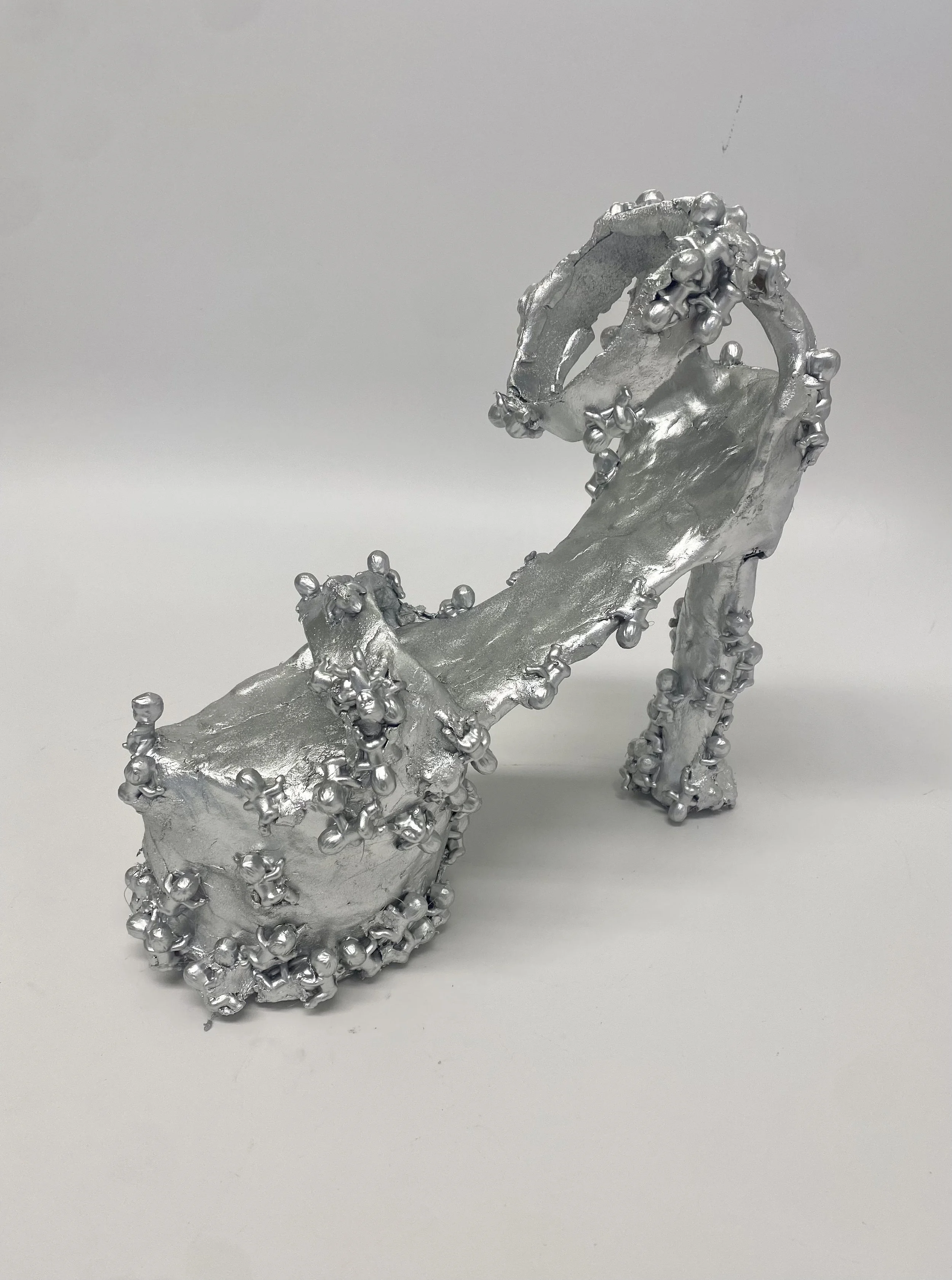 A chrome-painted wedge heel wrapped in crawling king cake babies, climbing across the straps, platform, and heel. Equal parts surreal and unsettling, Silver Swarm honors my Louisiana roots while transforming innocence into a provocative swarm of symbolism.