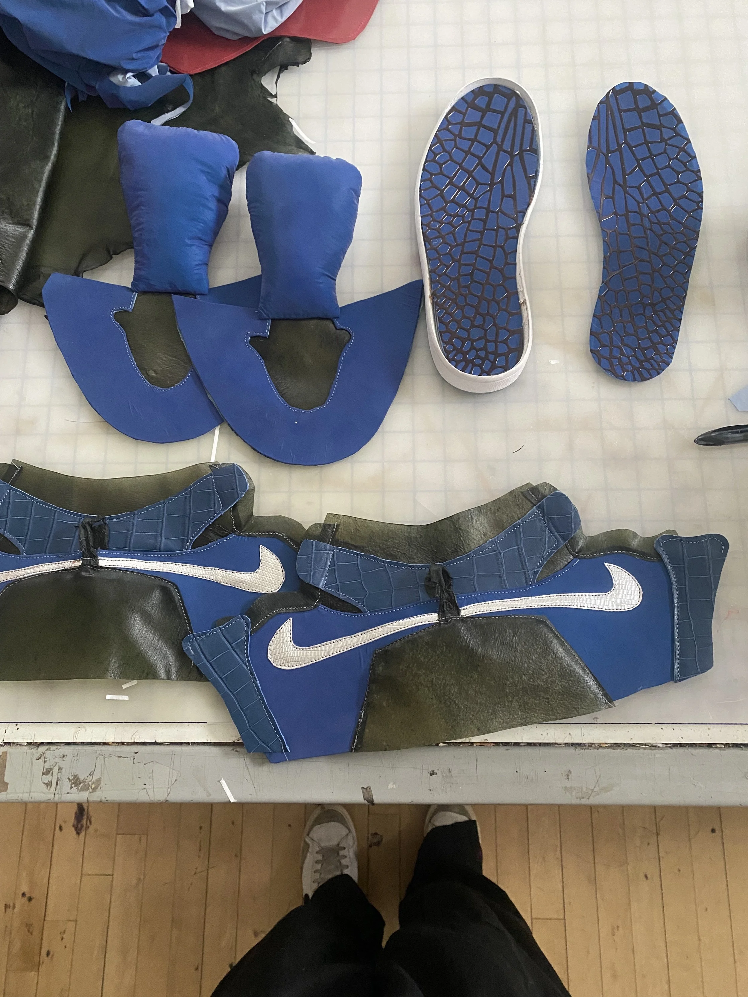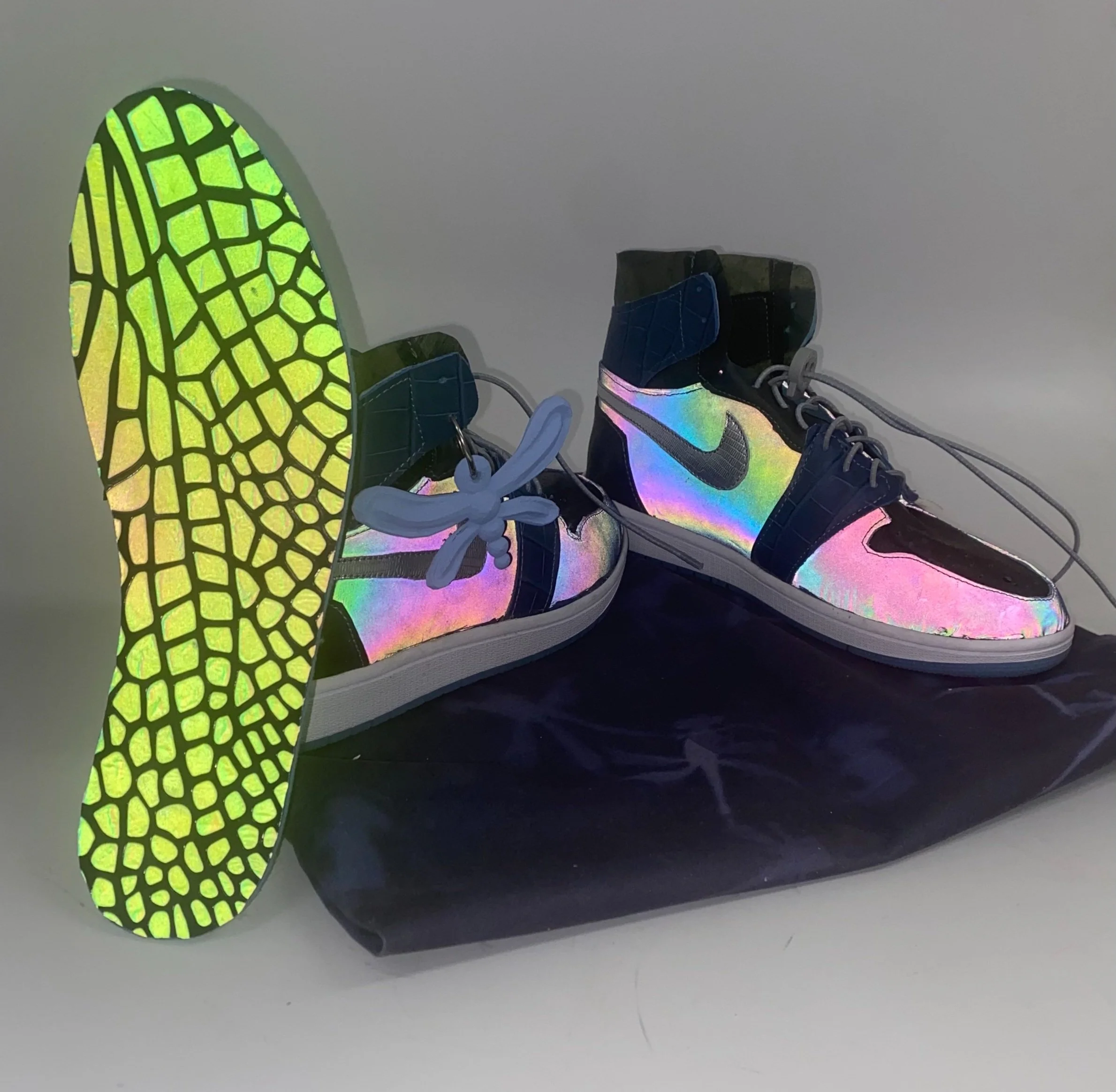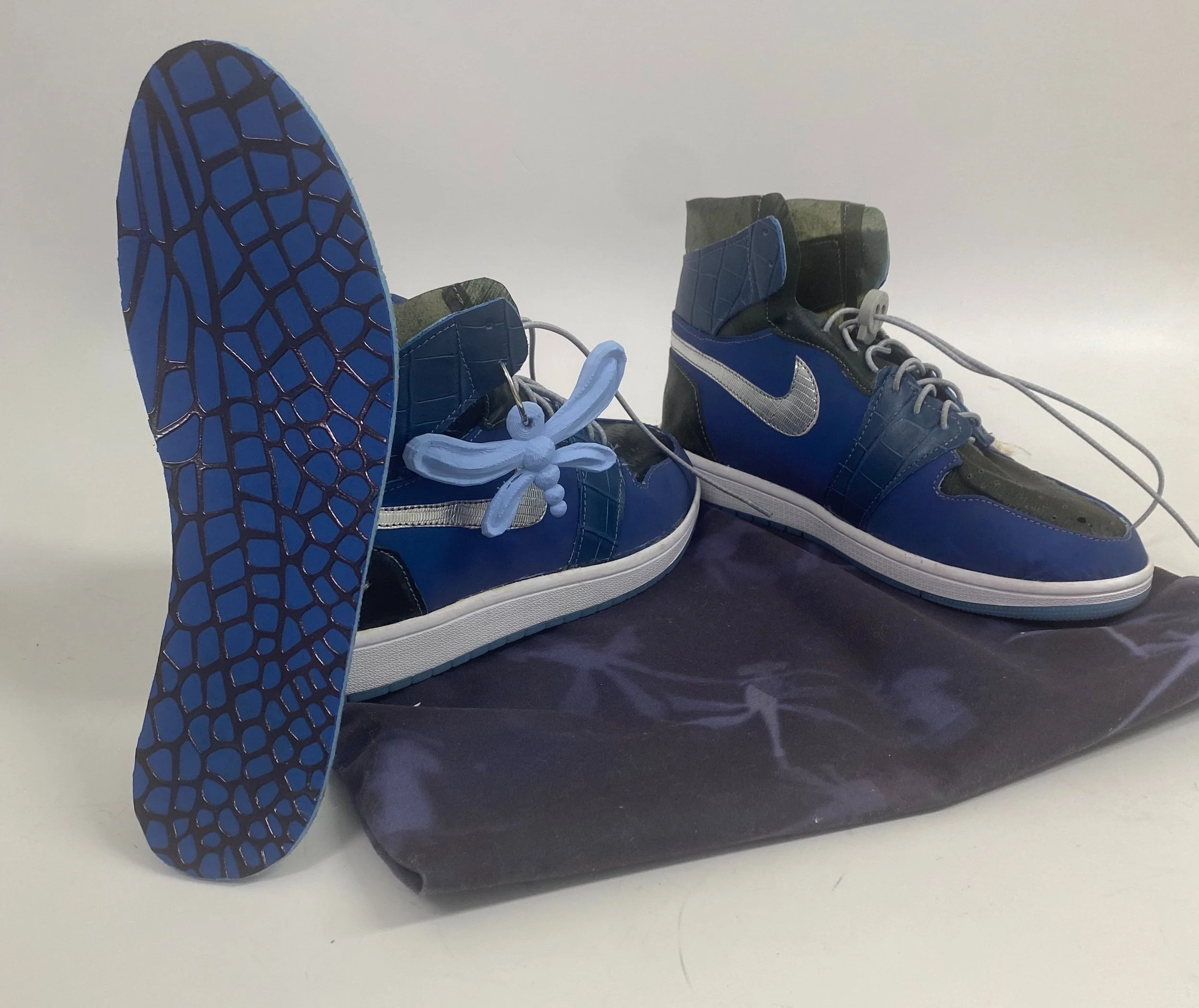 Born from memory and transformation, Lucente reimagines the Air Jordan through the lens of the dragonfly — an ever-evolving symbol of strength and rebirth. Iridescent taffeta shifts from sapphire to full-spectrum under flash, while green transparent horsehide overlays echo the delicacy of dragonfly wings. A navy embossed gator grounds the silhouette in texture and pattern, and a custom UV-printed sole reveals ghosted wing imagery beneath the foot. Lucente is a story of becoming — seen, unseen, and ever-shifting.