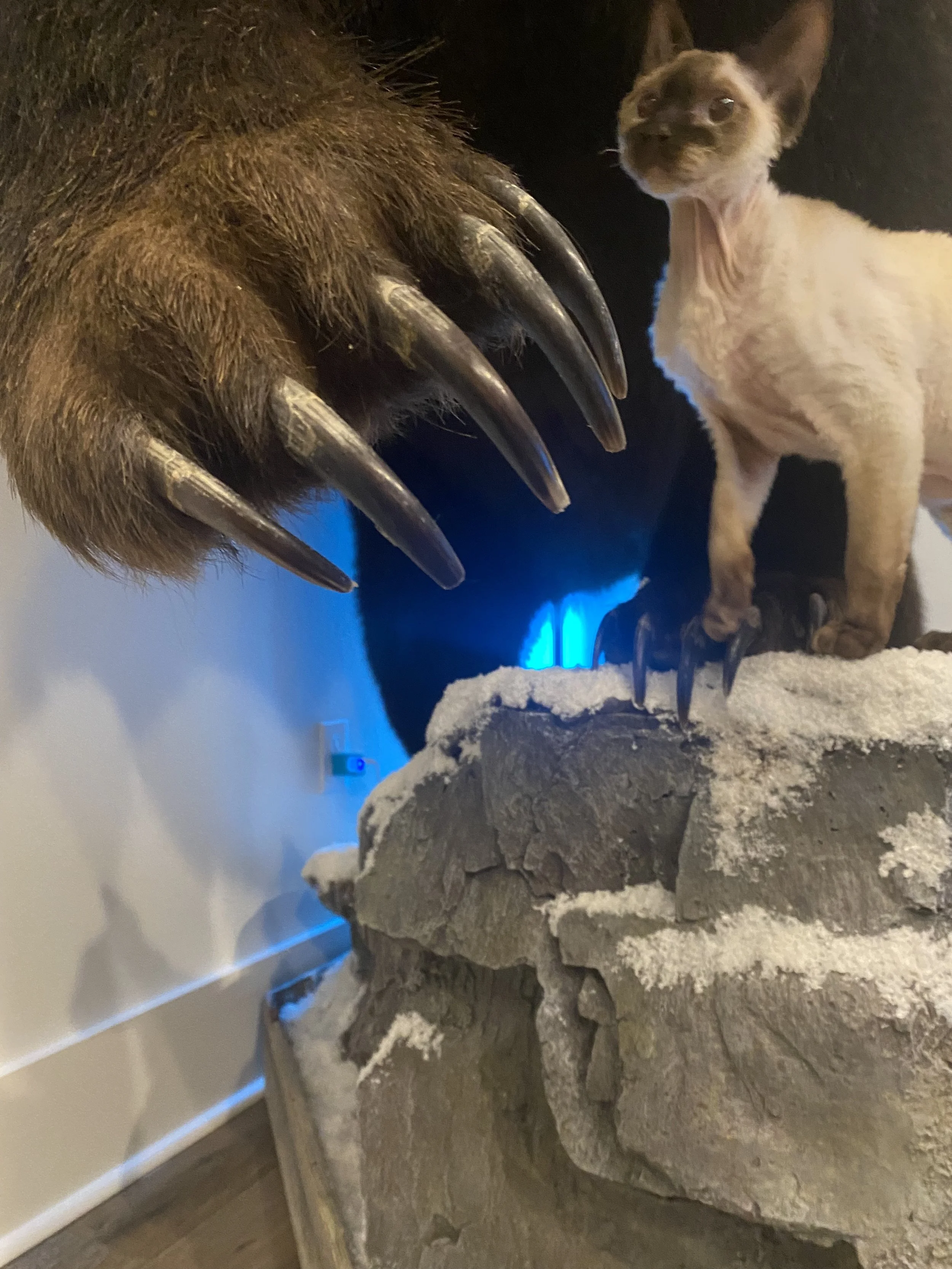 Blue suede, fingerless and thumbless, rimmed in the same fluffy fur. Equal parts fantasy and fight-ready.