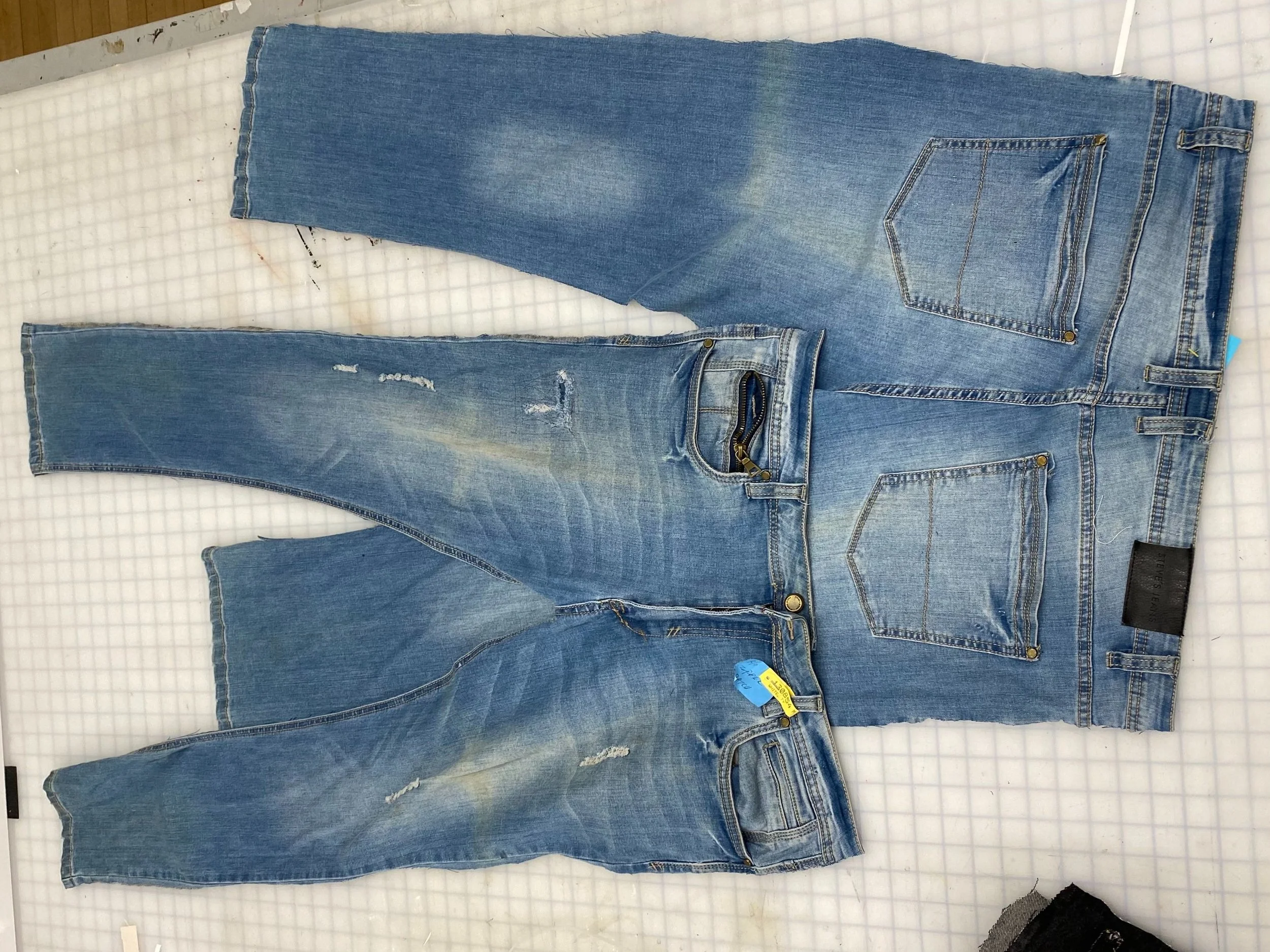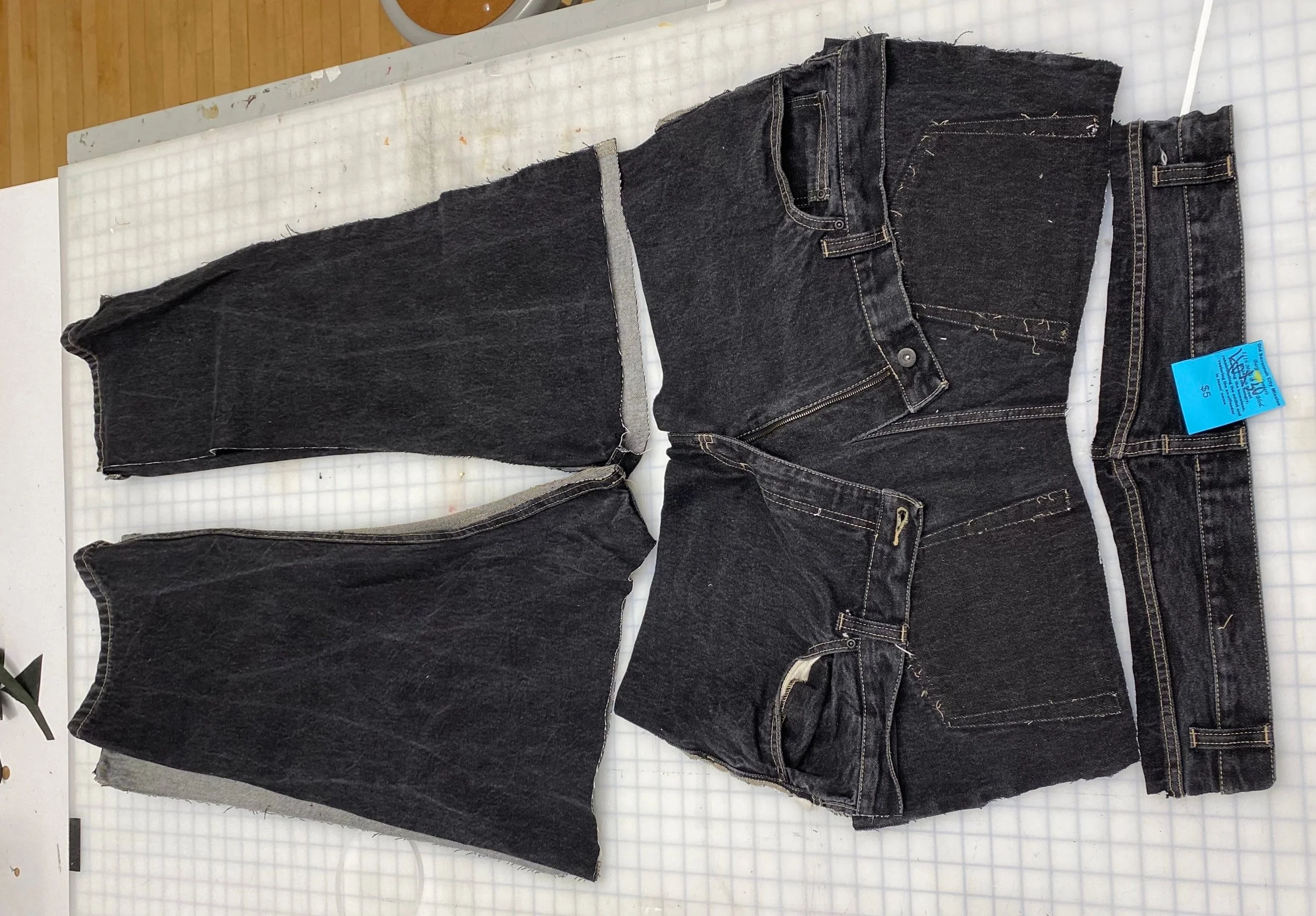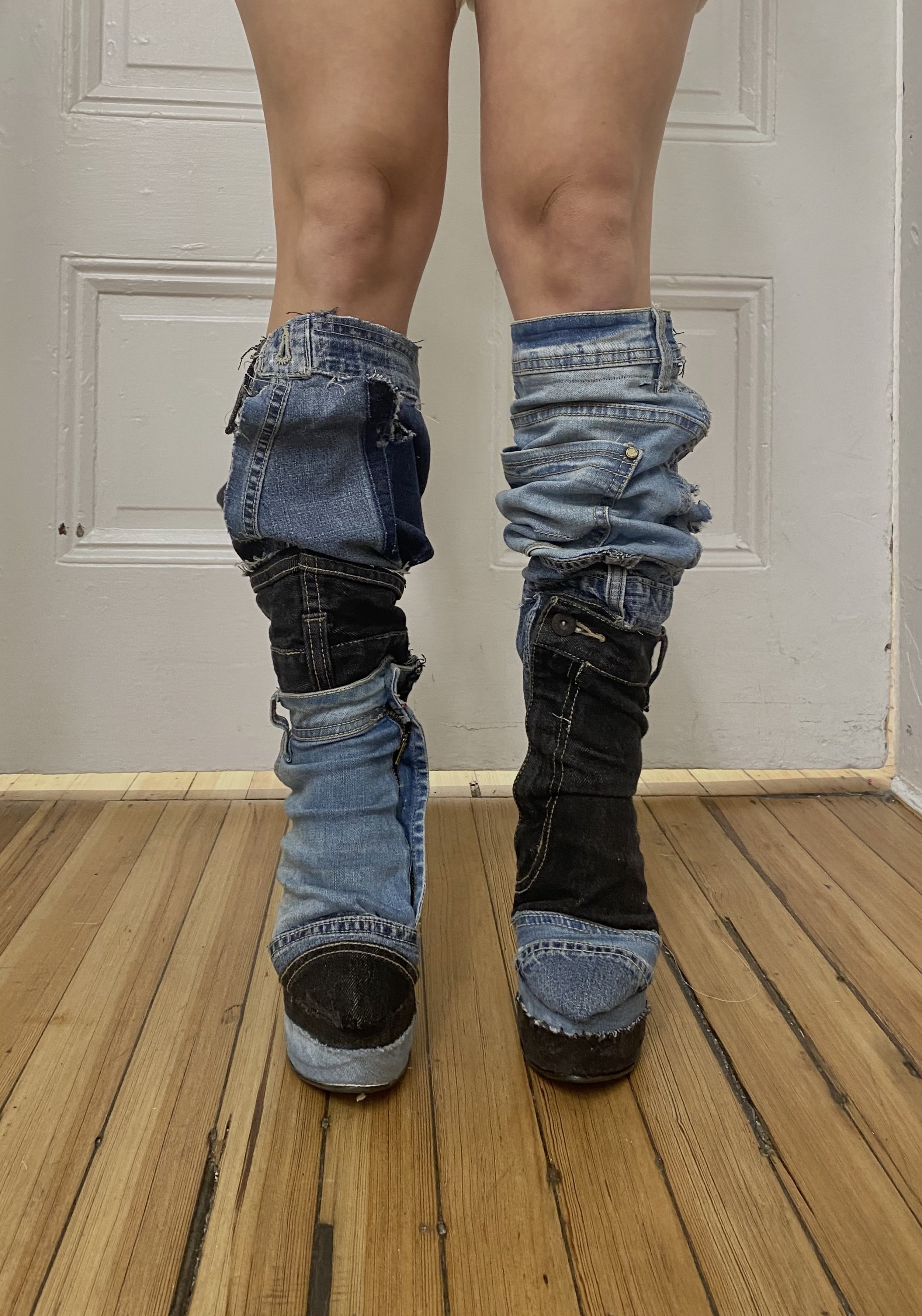 A knee-high boot constructed from torn-apart vintage denim, layered in alternating dark and light panels. Built on a modified heelless platform salvaged from the thrift, Frayline channels raw ingenuity and gritty glam through an upcycled lens.