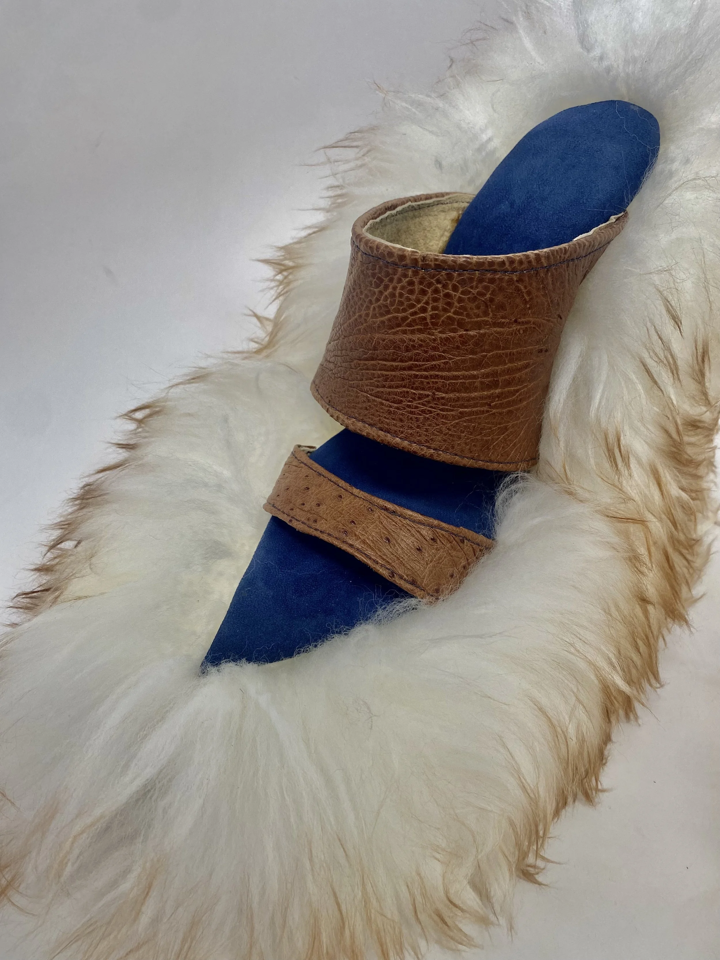 The main event, 7-inch open-toe wedge wrapped entirely in sheep’s fur, with navy suede insoles and genuine cognac ostrich leather straps. An icy yet primal statement heel designed to conquer, not coddle.