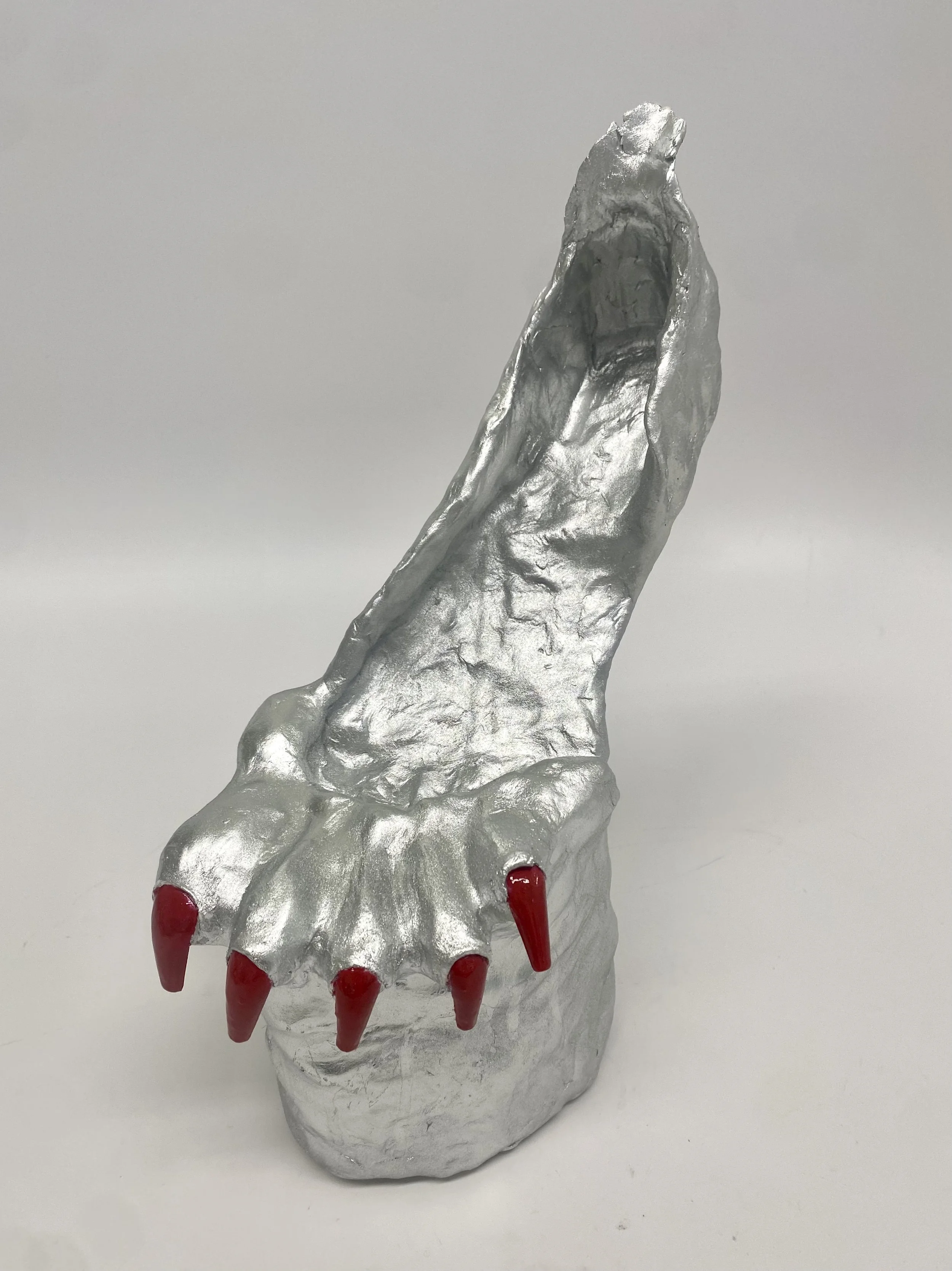 An unwearable, foot-shaped silver platform with molded toe impressions and red coffin nails piercing forward. Clawform plays with bodily exaggeration, glam horror, and the power of monstrous femininity.