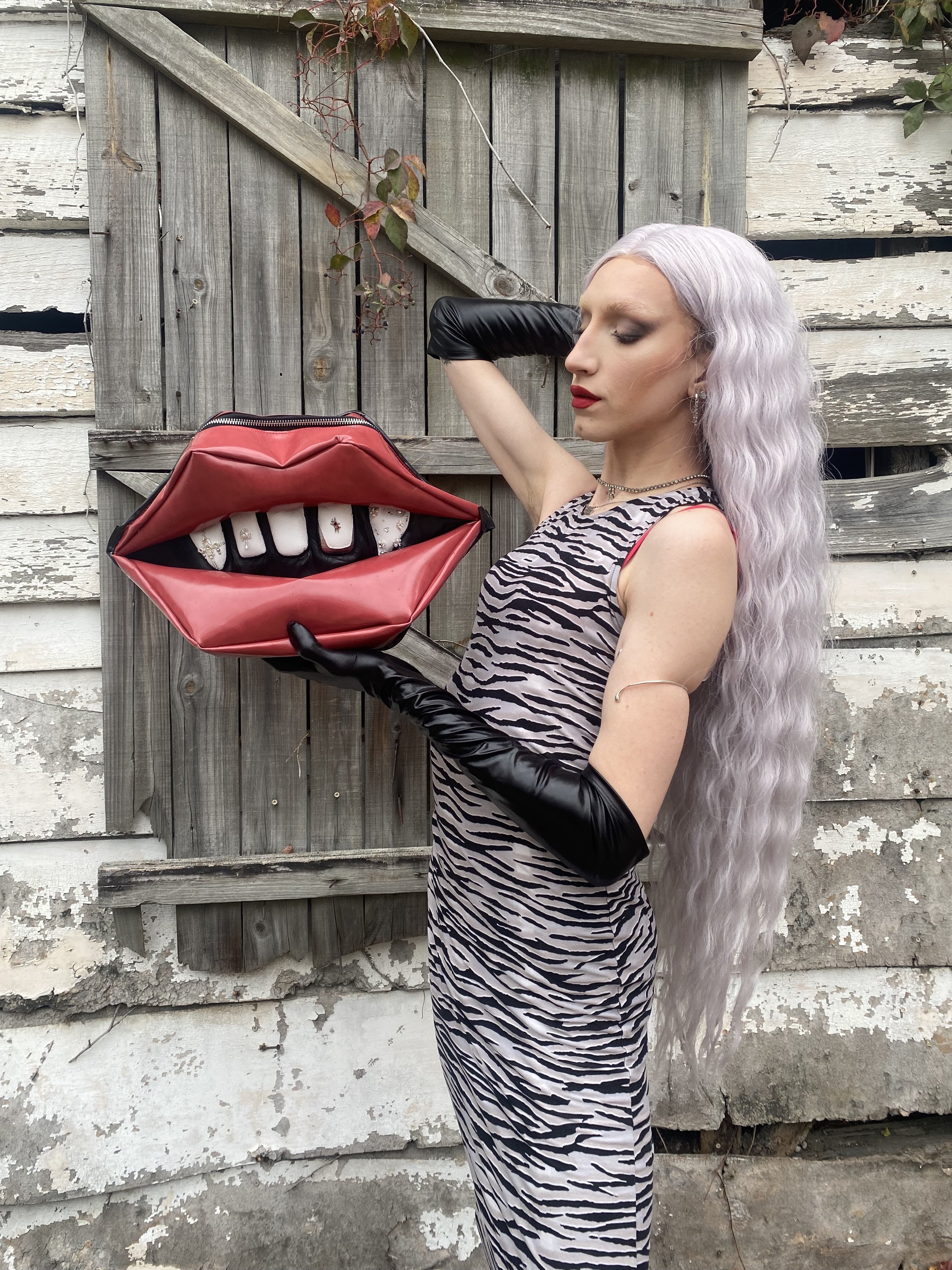 Adorned in glimmering patent red and mischievously misshapen crystalized teeth, Glitz Pout is your unapologetic statement piece with a sly grin. Though petite in size, she’s maximal in presence, featuring black piping along the edges and a semi-wide gusset that elevates her sculptural silhouette. This was the first iteration of my signature lips, setting the tone for future concepts—bold, charming, and built to be seen.