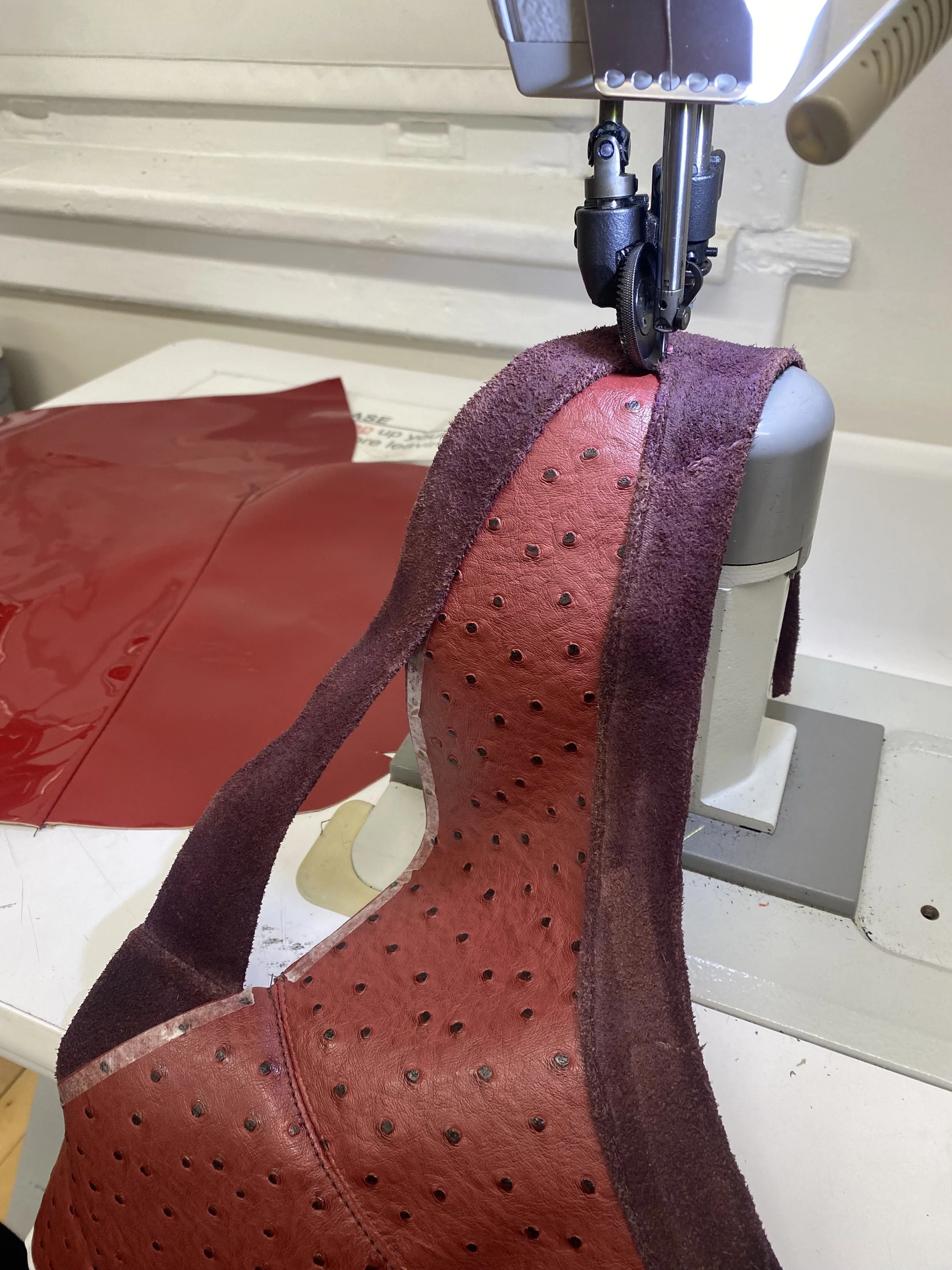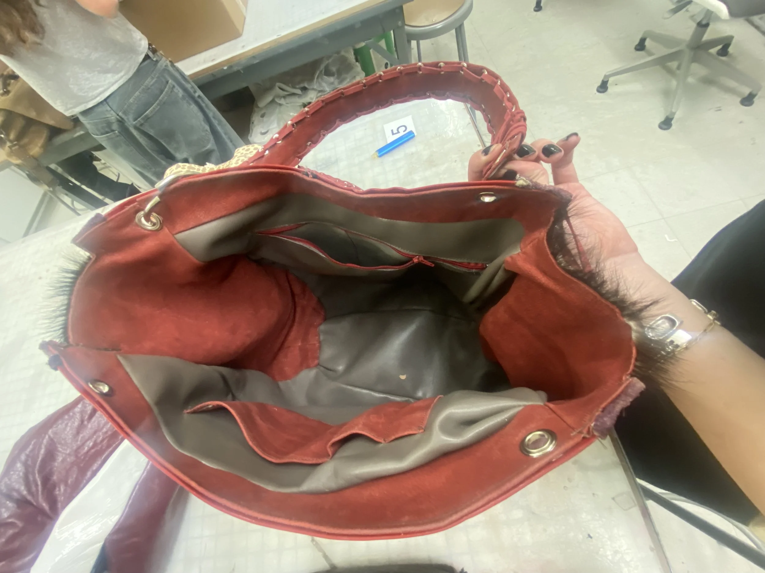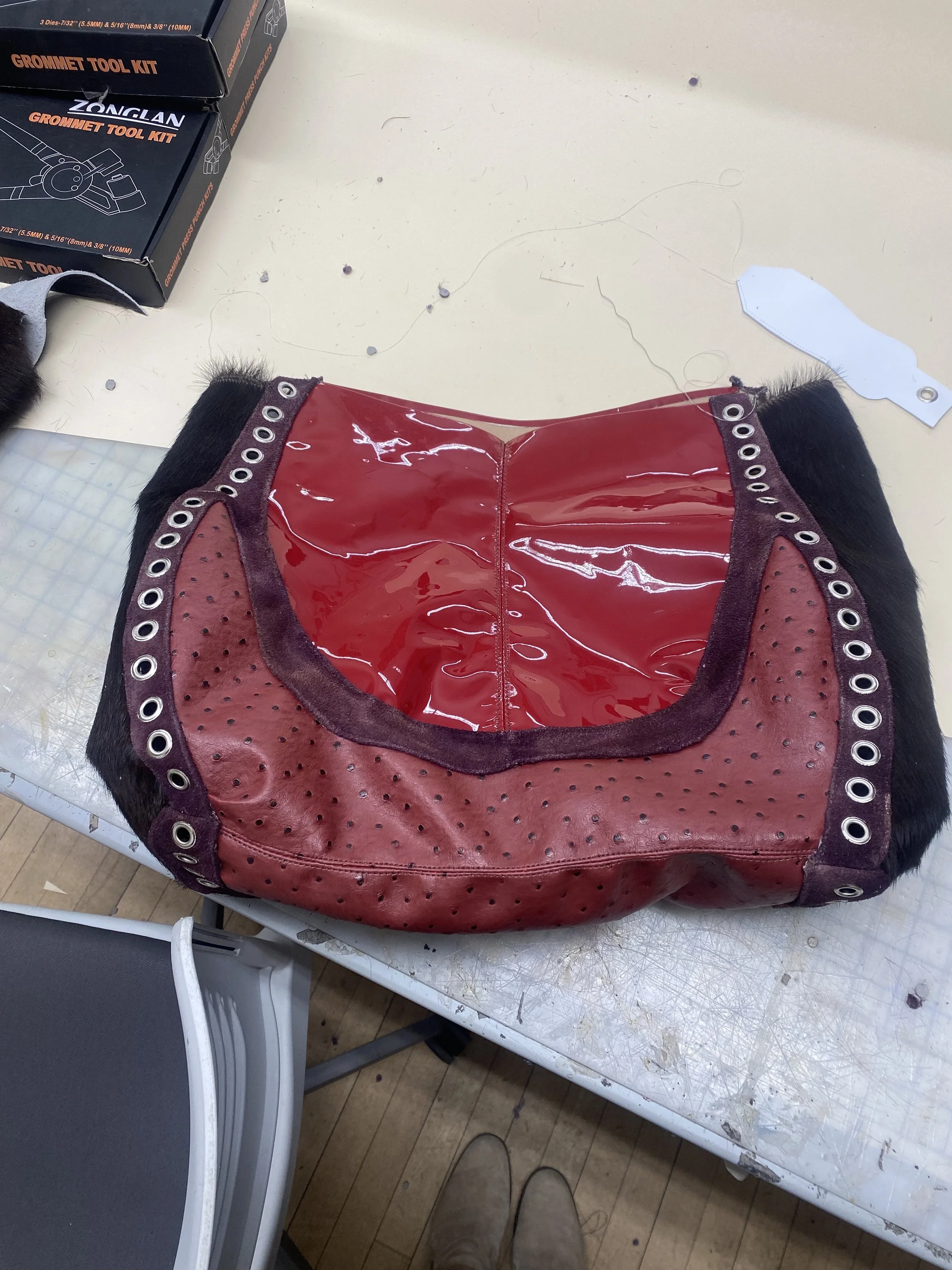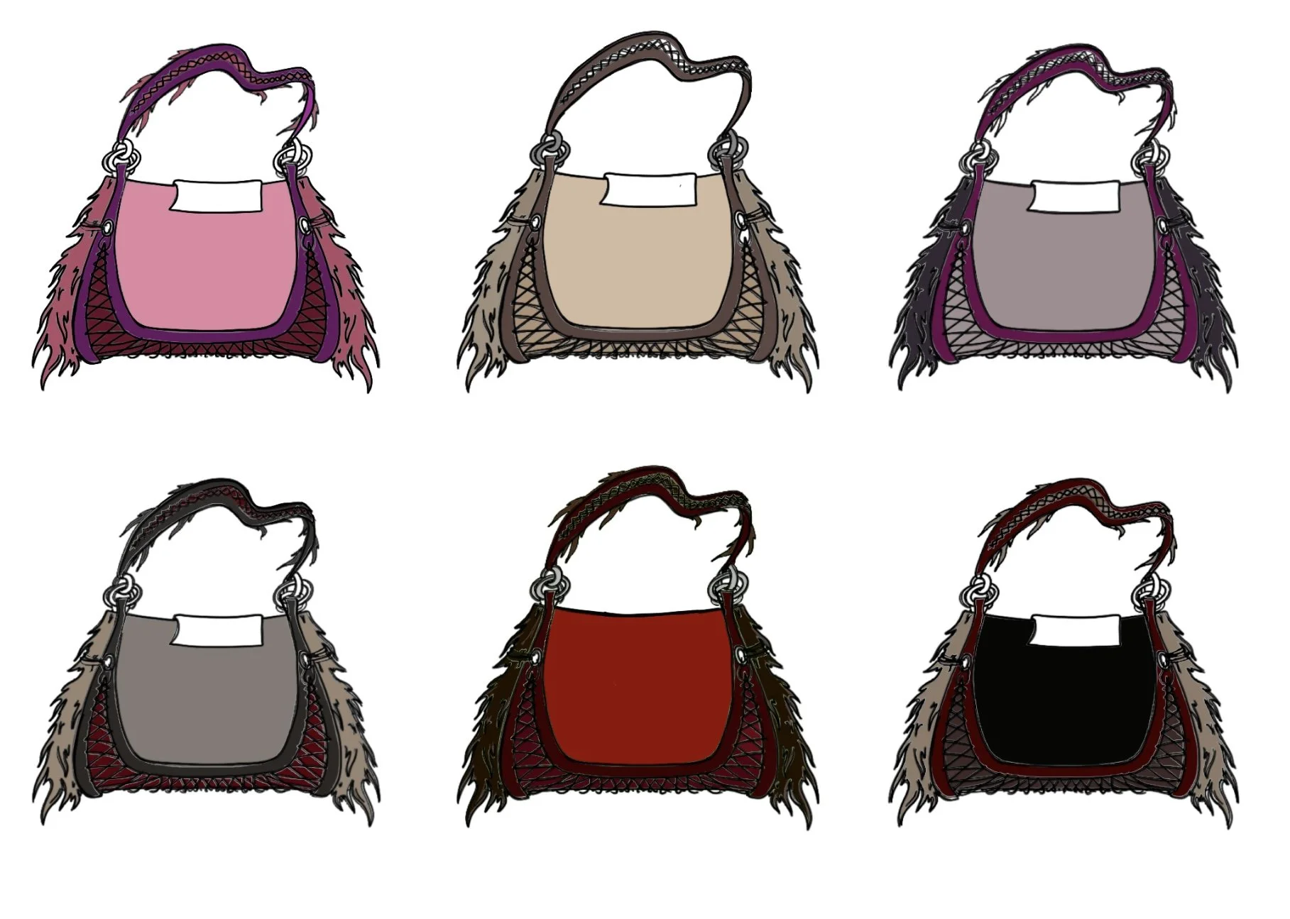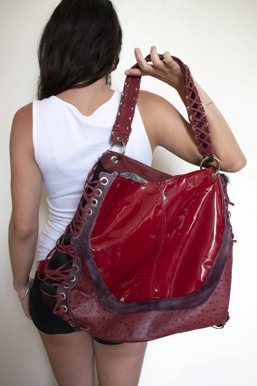 A bold city bag in red patent leather, maroon suede, and embossed ostrich, with black wildebeest side panels and red suede corset-lacing threaded through silver grommets. Dominion demands attention, an everyday bag built for extraordinary people, adorned with softness, power, and pride.