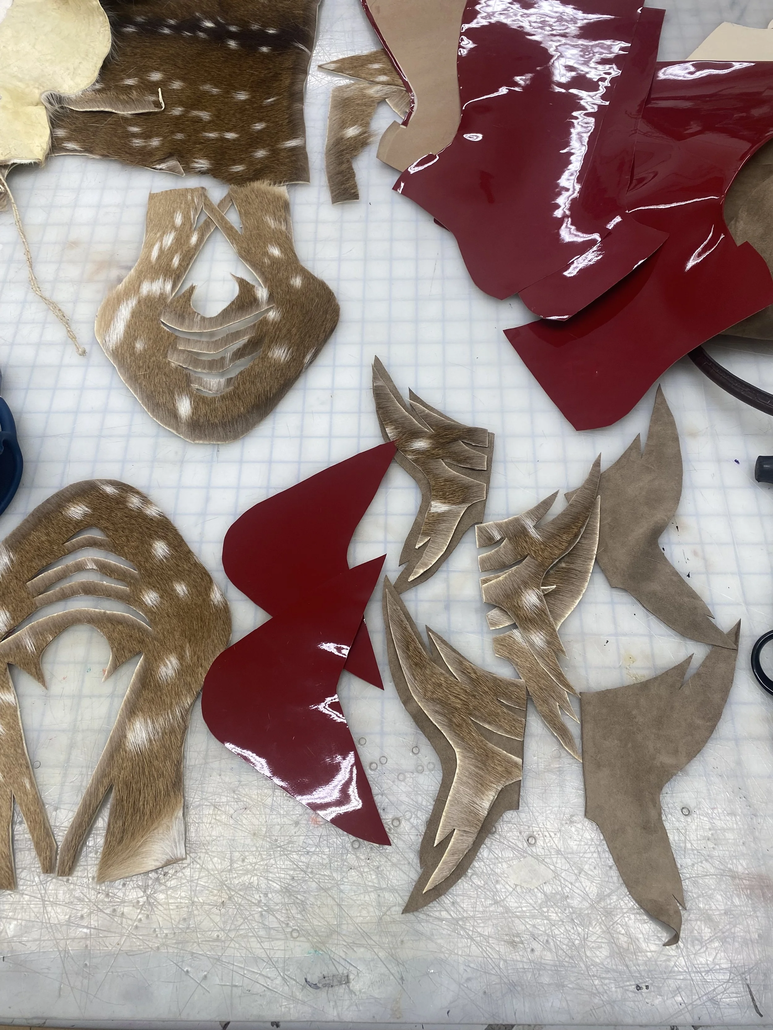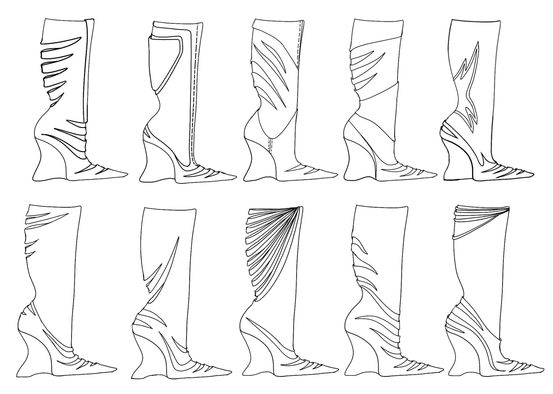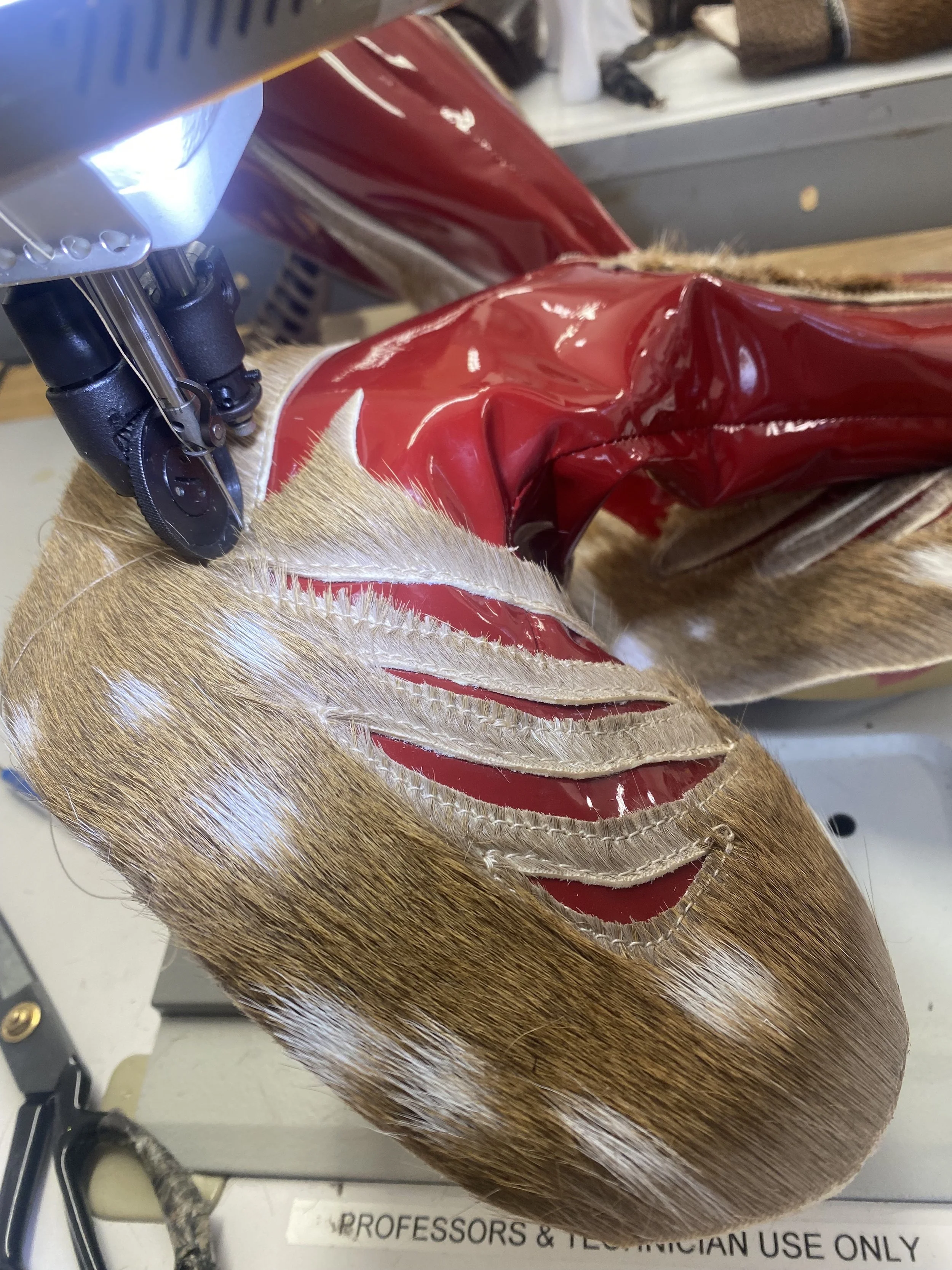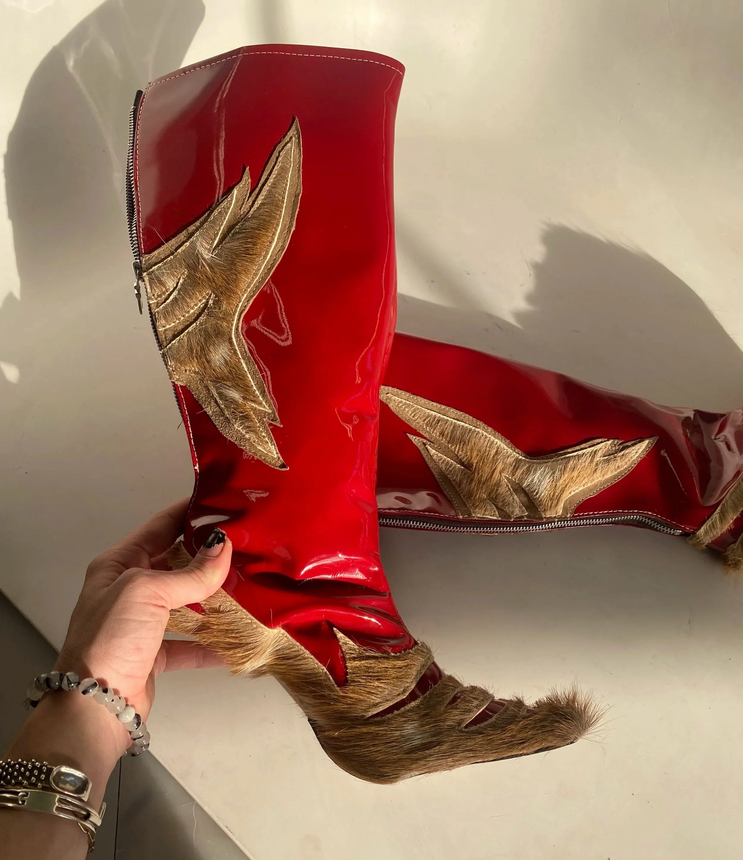 This sculpted wedge boot turns heads in red patent leather, with suede and axis hide panels that slash across its silhouette in layered seduction. Cutouts reveal glossy red beneath, a daytime boot meant for not for strolling, but strutting.